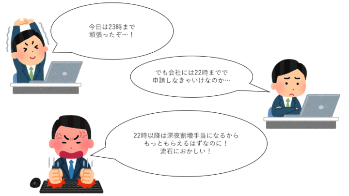 「22時までならまだ甘いのでは?」と思う方もいるかもしれませんが、この時間は「会社に残業したことを申請できる時間」であって、実際の残業時間ではありません。