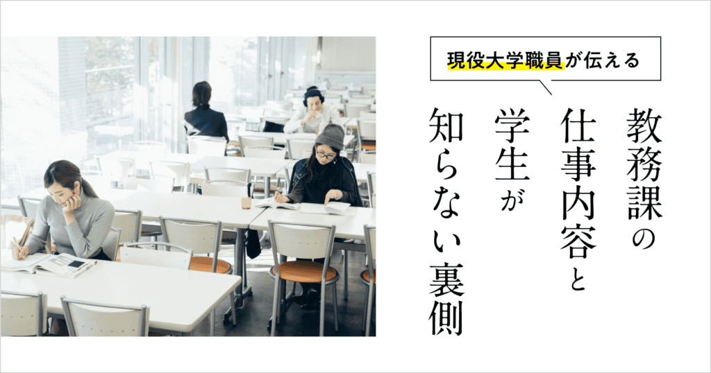 この記事では現役の大学職員が教務課の仕事内容を紹介します。この記事を読むことで学生が知らない教務課の窓口の奥で行われている仕事がわかり、大学職員の仕事内容を知ることができます。