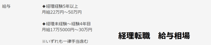 転職Doが独自に行った調査によると、実際に転職サイト「リクナビ」に合った求人では、経理経験5年以上の中途採用者の場合、月給22万円以上が保証されているのに対し、未経験の場合は17.5万円スタートと、4.5万円の差がついている企業も。
