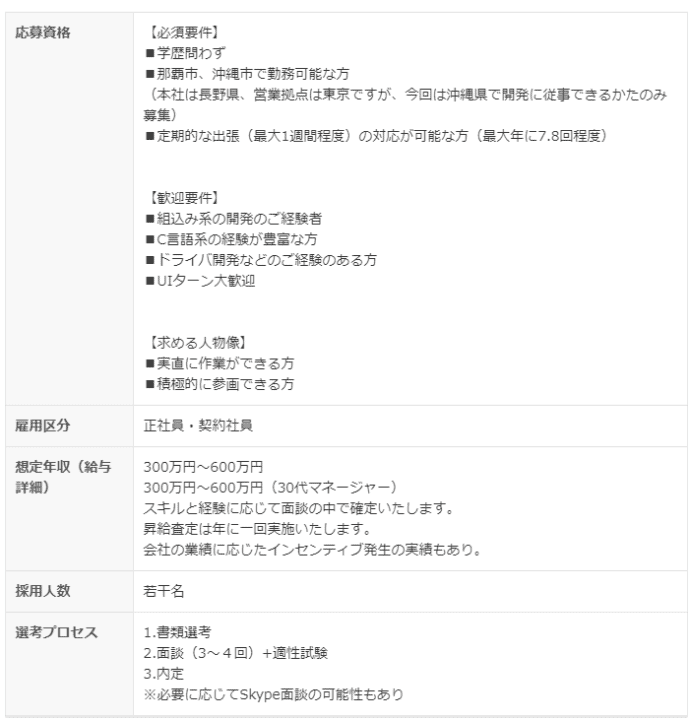 こちらは長野県に本社のある製造業の会社で、沖縄県勤務のC言語プログラマの採用情報です。
