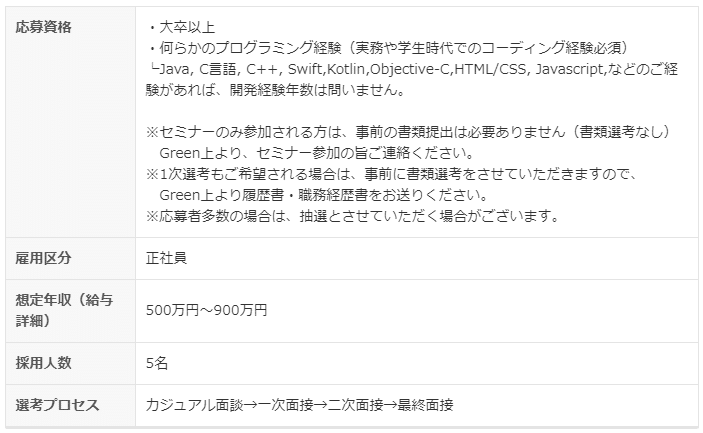 こちらの求人は想定年収が 500万円~と、高めに設定されています。その代わり、応募条件が大卒以上で、実務経験が必須と応募資格のハードルは高くなります。講師というのはエンジニアやプログラマとは異なるノウハウの必要な職業ではありますが、「人を育てるのが好き」「関わった人が成長するのが嬉しい」という方にとっては天職といえるのではないでしょうか。