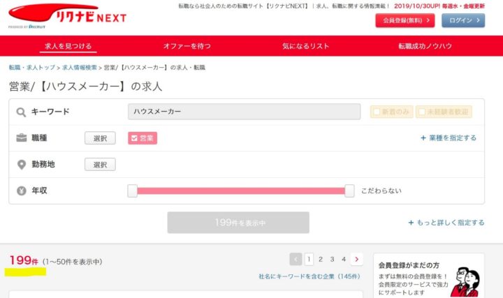 以下はリクナビNEXTで未経験歓迎のハウスメーカー求人数です。
