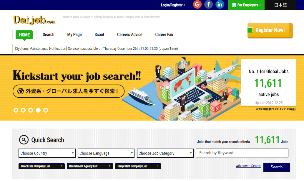 A screenshot of Daijob, a website that has been servicing bilingual and multilingual talent looking for jobs in Japan since 1998.